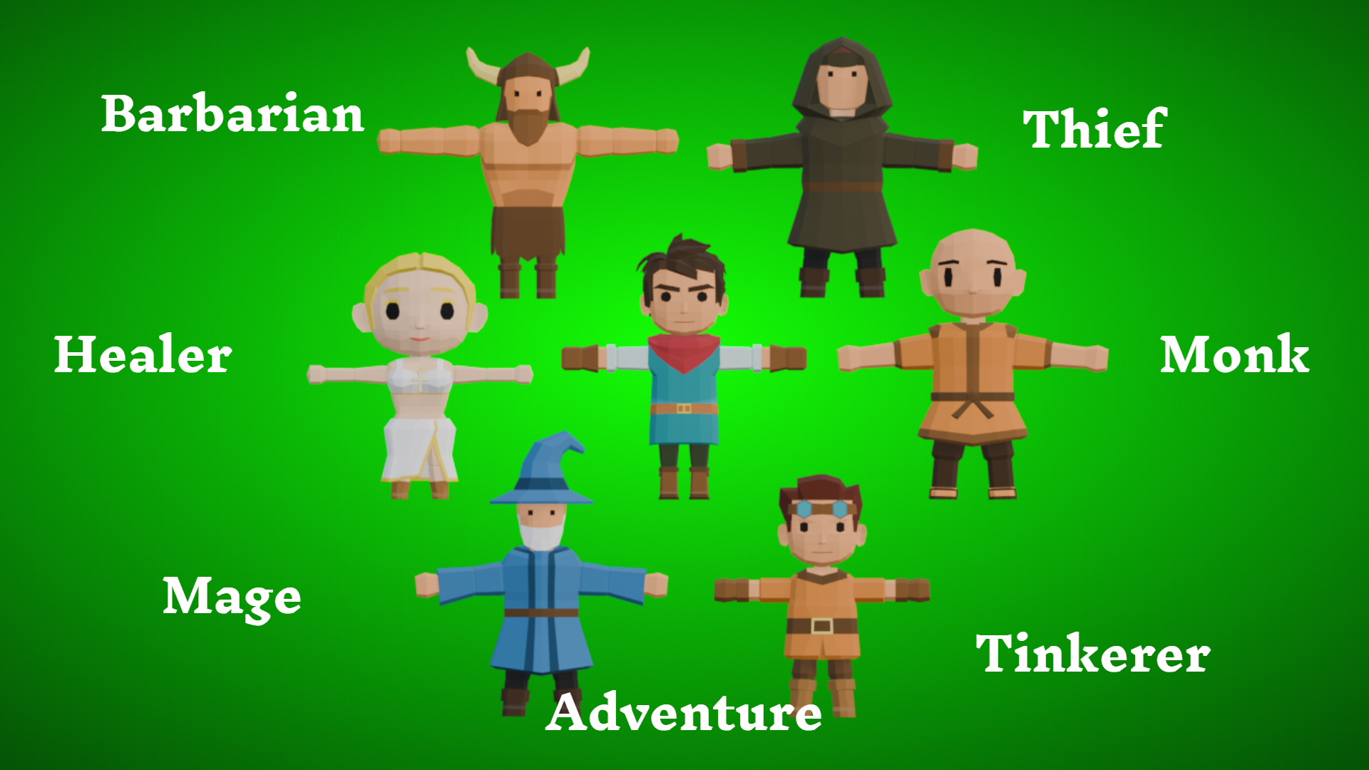 Adventurer, Healer, Monk, Tinkerer, Mage, Barbarian, Thief โ low-poly rigged characters for your game