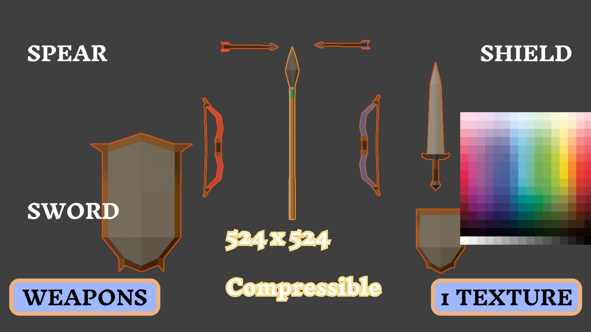 - Weapons: Sword, Shield, Great Shield, Spear, Bow & Arrow (Red + Blue)